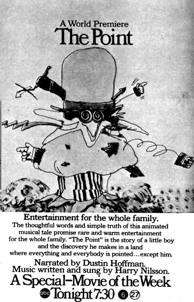 The Point!, a cartoon counterpart to Harry Nilsson’s album of the same name, premiered as an ABC Movie of the Week on 2 February 1971. After its initial broadcast, the film developed a surprisingly long second life, screening at indie cinemas as a midnight feature, filling up late-night space on basic cable, and getting rolled into classrooms as an accessible way to talk to kids about bullying and diversity. What made this film significant on its original broadcast, and why are we still watching it today?