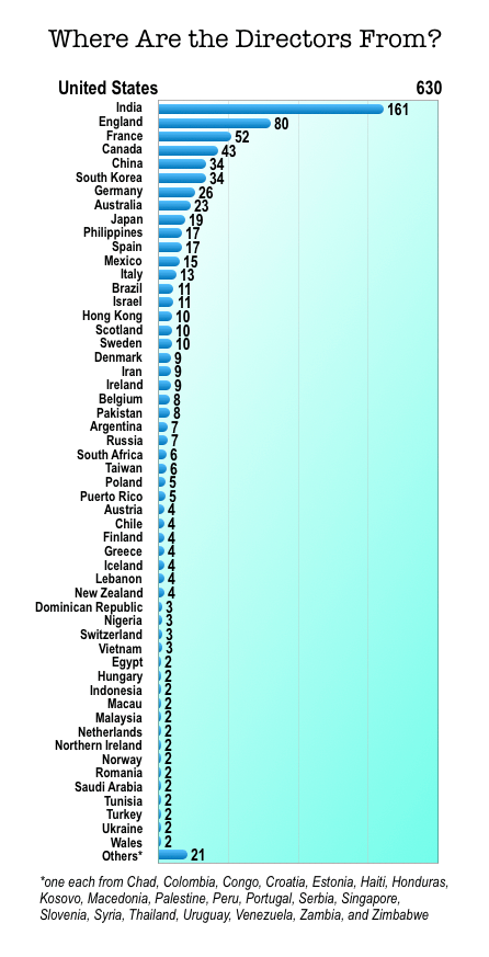 I opted to track where the directors were from instead of where the films were from for two reasons. One is that a person’s biography is simply more interesting than a movie’s. The other is that a lot of movies are international co-productions between two or more countries, and it’s a nebulous concept anyway. If the movie was made in Canada with Canadian funding, but the director, writer, and cast are all American, and it’s released by an American distributor, is that an American film or a Canadian one?