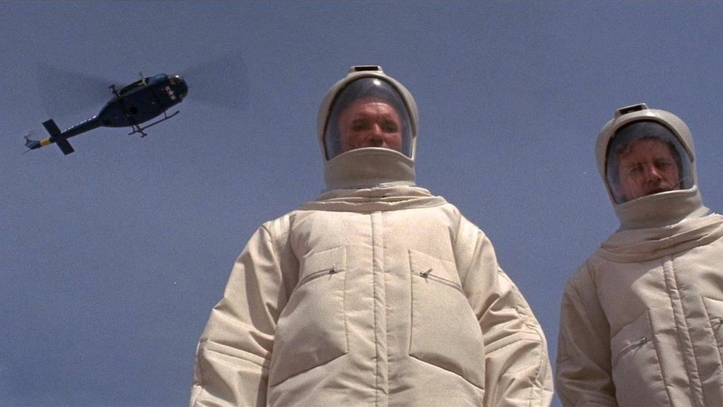 That ironic thought speaks to how both films are secretly satiric and darkly funny, the ultimate “joke” being that the oppressed and haggard protagonists are complicit in their own undoing. THX 1138 appears at first to be set in a fascistic police state, yet the fascism is ultimately revealed to be missing a figurehead—there is no dictator (or “Emperor,” as Lucas’ later Star Wars films would bluntly utilize), merely a self-running series of computerized systems. THX is tortured while in prison not so much deliberately as accidentally by two blue-collar technicians arguing on how to properly use the devices, and the movie’s mono religion—a figure known as “OMM”—is revealed to be nothing more than an electronic voice recording. In a wonderfully bureaucratic twist, THX is allowed to escape at the end of the film because his recapture would simply cost too much. The scientists of The Andromeda Strain are nearly killed thanks to bureaucracy—their order to nuke the site of Piedmont, New Mexico to help stop the spread of the virus is kept in political limbo for days, and their state-of-the-art facility becomes hindered by cost-cutting materials and a paper jam. There’s a hint of the Michael Crichton who would go on to create Westworld (1973) and Jurassic Park (1993) seen in Wildfire’s failure, as the facility is one big scientific/medical amusement park, filled with enough bells and whistles to distract from its nearly fatal flaws.