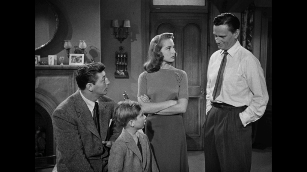 First, though, he comes up behind her and forcibly grabs her for a kiss that she hasn’t consented to, although she melts into his embrace, as expected. Steve is no brute, but that kiss provides another contrast between him and Carl: Carl has been patiently waiting for two years for Connie to agree to marry him, while Steve marches in and takes what he wants. A less graceful movie would then allow Steve to run roughshod over Carl, whom Connie would easily toss aside, but Holiday Affair keeps Carl around, as a further example of healthy masculinity for both Timmy and the audience.