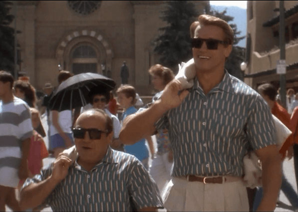 On the screen, Twins takes fewer dominoes to believe. Off screen, it took a multi-million-dollar gamble for anyone to even consider it. In 1988, Arnold Schwarzenegger was not a funny man, at least as far as studios were concerned. If he wasn’t holding a gun or David Patrick Kelly off a cliff, nobody wanted to see him, or so The Powers That Be thought. So for his comedy debut, Arnold sought out the director of Ghostbusters, a movie some 19 spots higher than The Terminator on the biggest box office successes of 1984. Reitman was won over by his unexpected charisma and intelligence, neither of which had gotten much screen time by the late 1980s, and they made a very risky deal. Along with Danny DeVito, Reitman and Schwarzenegger wouldn’t take salaries on Twins in exchange for a sizable percentage of the profits. With a relatively low budget of around $16 million, the studio didn’t have much to lose. For their bravery, Arnold, Ivan and Danny earned record paychecks on a historic deal that no studio will ever agree to again.