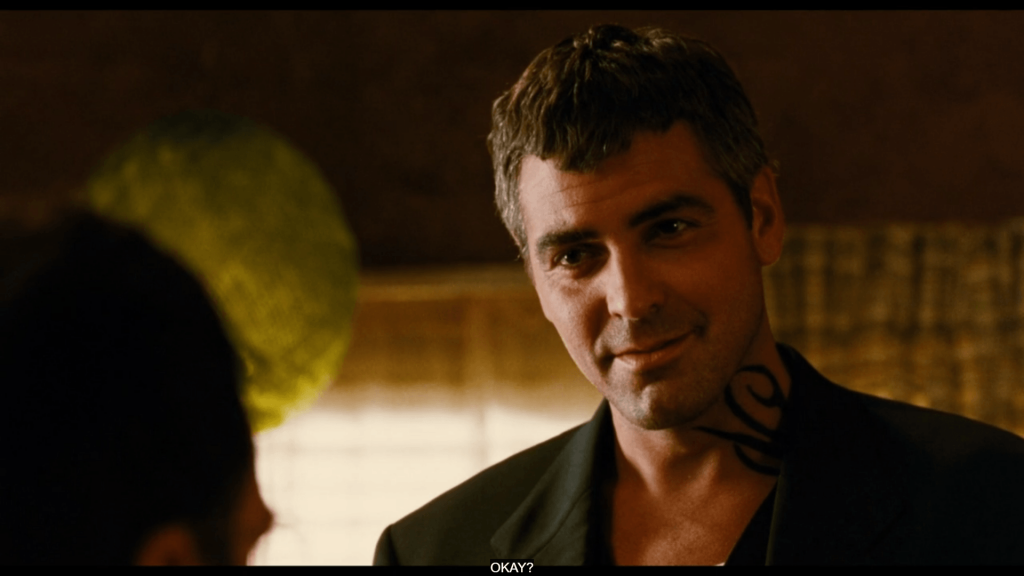From Dusk Till Dawn was Clooney’s first starring role in a feature film (after an audition for Tarantino’s Reservoir Dogs didn’t work out; as he told Robin Givhan in a January 1996 Washington Post profile, “I sucked”) and as Seth Gecko, he puts forth all the charm accumulated and perfected over years of TV work, from Roseanne to Bodies of Evidence to Sisters. He’s devilishly handsome, his customary head tilt—half fascinated, half irritated—used to great effect to intimidate enemies, deliver commands, and assess the tide of vampires desperate to drink his and his fellow humans’ blood. He’s physically imposing, the tan and Caesar haircut recognizable to fans of ER contrasting with the fiery tribal tattoos licking up his arm and his neck; has any man looked this good in a blank tank top? And unlike Tarantino’s Richie, who is aggressively whiny and annoyingly trigger-happy, Clooney’s Seth is subtler about it, his ability to convince and cajole with his hunched-forward shoulders and his slight smile as compelling as his skills fighting vampires with a revolver, a makeshift cross made out of legs from a bar table, and condom balloons filled with holy water.
