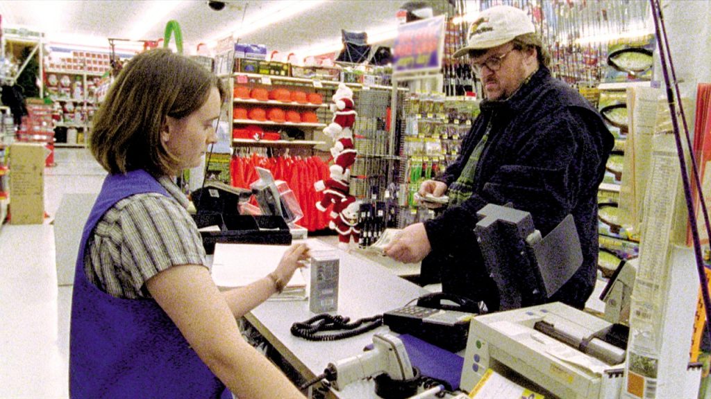 His most controversial moves are the brutal montage sequences set to happy music. Moore’s out looking for the Big Bad behind all the things that are corroding America. One of his grand theories is that America’s gun culture is tied to American foreign policy that plays kingmaker in countries all over the world with little care for the massive death tolls they leave in their wake. A montage set to Louis Armstrong’s “What a Wonderful World” reveals the sickening carnage left behind by American intervention makes a case, but still feels slightly derivative and disconnected from the rest of the film. Moore is more at home with direct confrontations with the powerful and complicit, as when he shows K-Mart executives the bullets stuck in the bodies of Columbine survivors. It’s also schlocky (and perhaps exploitative), but it reflects Moore’s authentic belief that shame and confrontation can enact change.