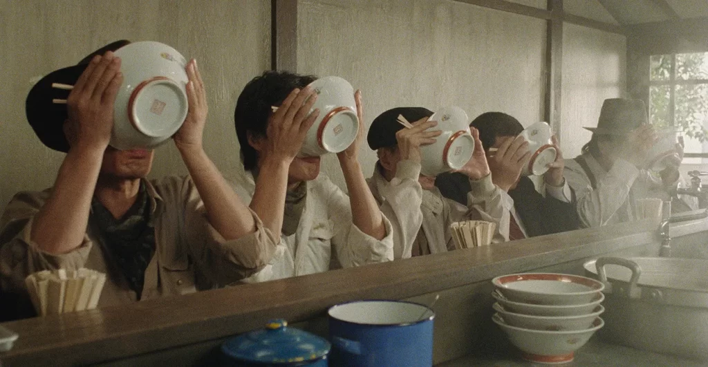 There is a central one: late on a rainy night, truckers Goro and Gun (Ken Watanabe), feeling the pangs of hunger, pull over to a noodle shop run by Tampopo, who’s recently widowed. She’s struggling with the demands of her tough-to-please clientele, including the pushy Pisuken (Rikiya Yasuoka) who wants her to sell to him. Goro, though, takes an interest in Tampopo, sensing the potential in her ramen which is “sincere but lacks character.” To help her become the best chef in town, he and Gun enlist a ragtag team to teach her the ropes, and also steal a few trade secrets along the way.