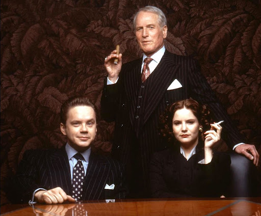 From the opening shots, as the camera glides over a scale model of New York City, Proxy announces itself as a very deliberate construction. Set in the final month of 1958, it’s a world of tall buildings, long tables, and conspicuous circles, beginning with the clock face at the top of Hudsucker Industries. The plot too has a circular structure – we meet hero Norville Barnes (played with affable gooniness by Tim Robbins) on New Years Eve as he climbs onto the building ledge and prepares to fall down its forty four stories (not counting the mezzanine.) How he got there and why is what most of the film concerns itself with, but unlike many of the 1950s classics that served as inspiration, it’s not easy to summarize. Perhaps it’ll suffice to say that he’s the titular proxy, brought up from the mailroom on his first day by Sidney J. Mussburger (a superbly officious Paul Newman) to run the company into the ground after the president takes his own leap from the top office. But Norville has some ideas he’s eager to share, and things don’t go according to plan.