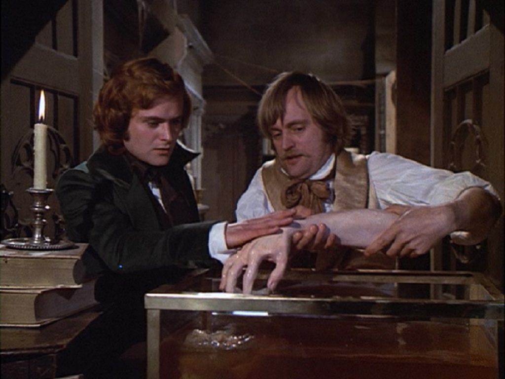 Following Mason’s introduction, the movie properly begins with its Victor Frankenstein (Leonard Whiting) witnessing the drowning death of his younger brother William, which spurs his lifelong obsession with conquering death. That’s typical for the character, but this Victor is more of a brooding romantic than a mad genius, and in both cases the process for bringing a monster to life comes from other characters.